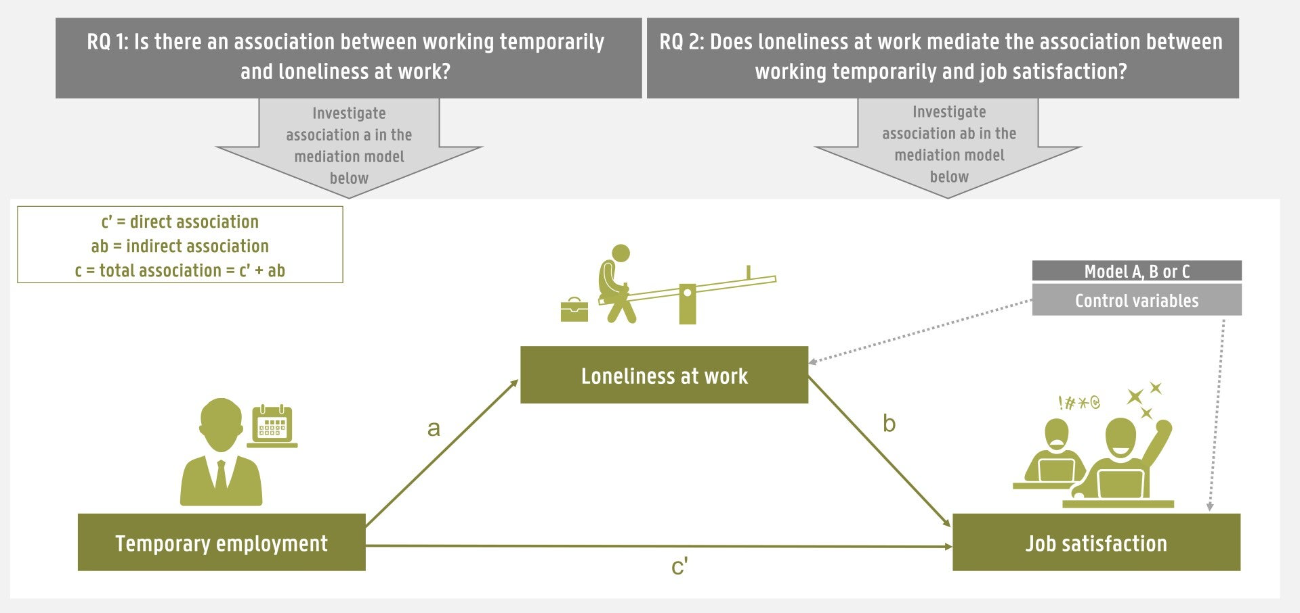 This research contributes to the limited literature concerning the determinants of loneliness at work, as well as to the literature on psychological outcomes associated with temporary work. More specifically, we are adding to the literature by exploring whether there is an association between working temporarily and loneliness at work and whether loneliness at work partly explains the association between working temporarily and job satisfaction. To this end, we analyse—by means of a mediation model—a unique sample of Flemish employees in the private sector. We find that employees with a temporary contract experience more loneliness at work as opposed to employees with a permanent contract. In addition, we discover that loneliness at work mediates the association between working temporarily and job satisfaction.